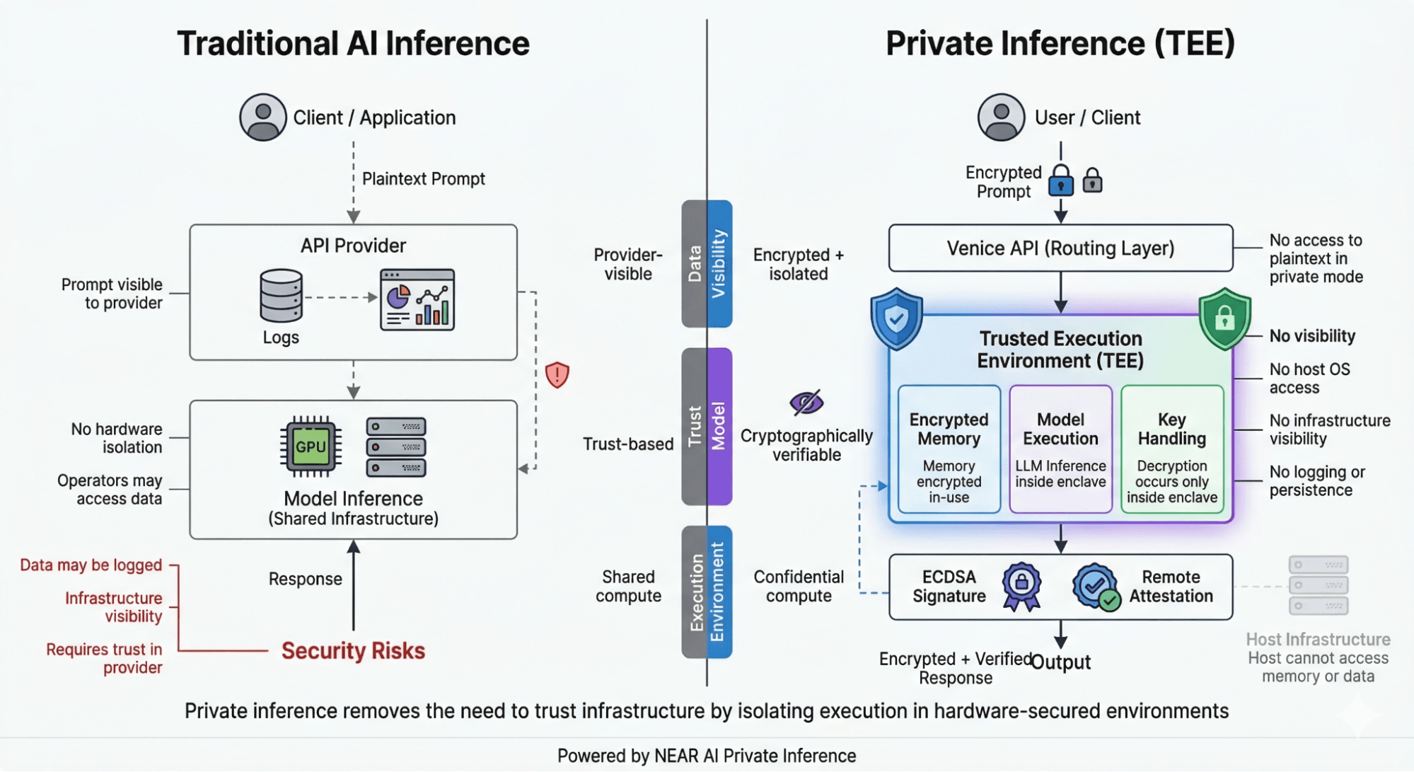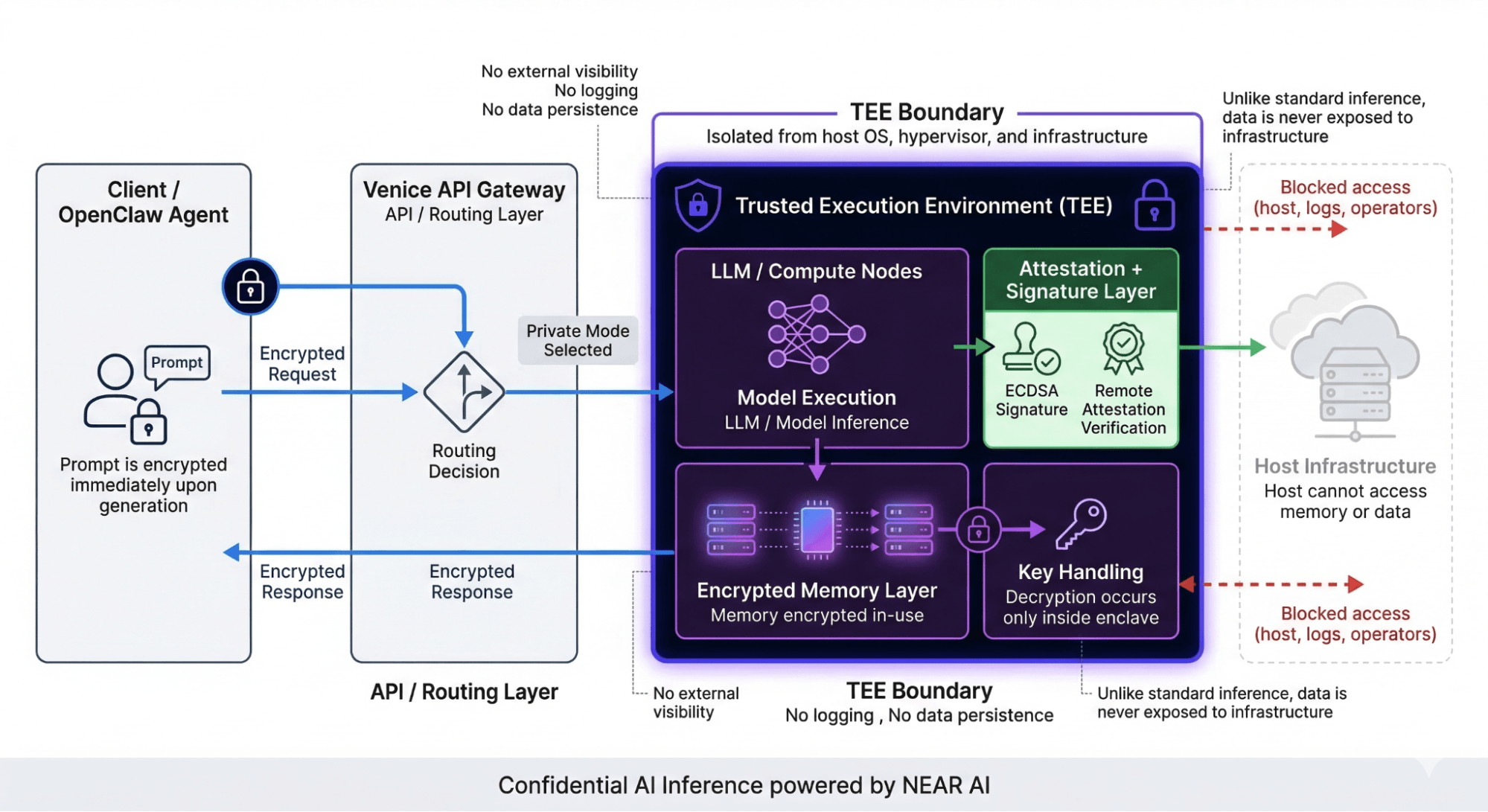 NEAR AI private inference removes that final exposure. Your request is routed into a secure enclave known as a Trusted Execution Environment (TEE)—a hardware-isolated partition of the processor that is sealed off from the host operating system, the cloud infrastructure, and any external process. The GPU provider sees nothing. Neither does NEAR AI or Venice.
